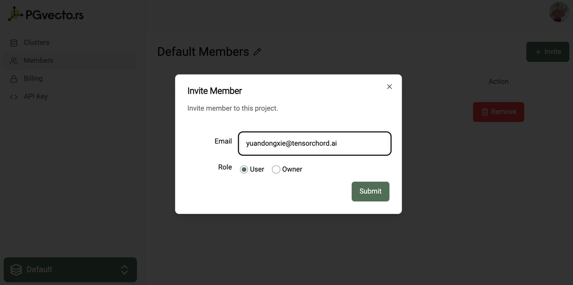 With VectorChord Cloud, everything starts with the project. It is the top-level object in the hierarchy. A project can hold as many Postgres clusters as needed. The maximum number of projects you can create and join is 5.